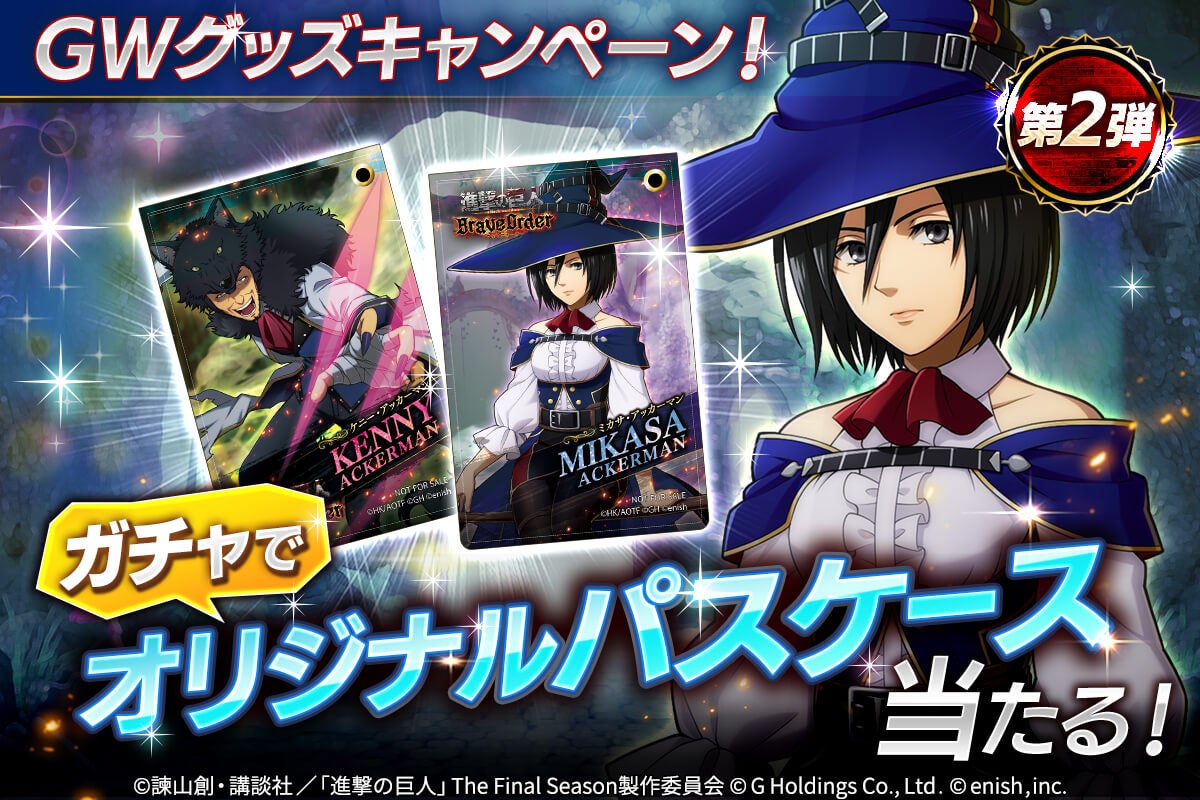 Starting May 5, 2023 (Friday), if you get lost in Fairy Tale (Half 2), you can get a limited pass with a clue[الجنية]Mikasa Ackerman and[الجنية]Kenny Ackerman by playing the gacha. Merchandise Campaign!