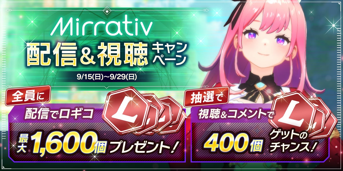 Starting Sunday, September 15, 2024, on the smartphone screen sharing game distribution platform “Mirrativ”, if you distribute the last note, you will get up to 1600, and if you watch and comment, you will get 400 by lottery (100 people will be selected by lottery) We will hold a campaign where each person can win up to 2000 Logicos in total.