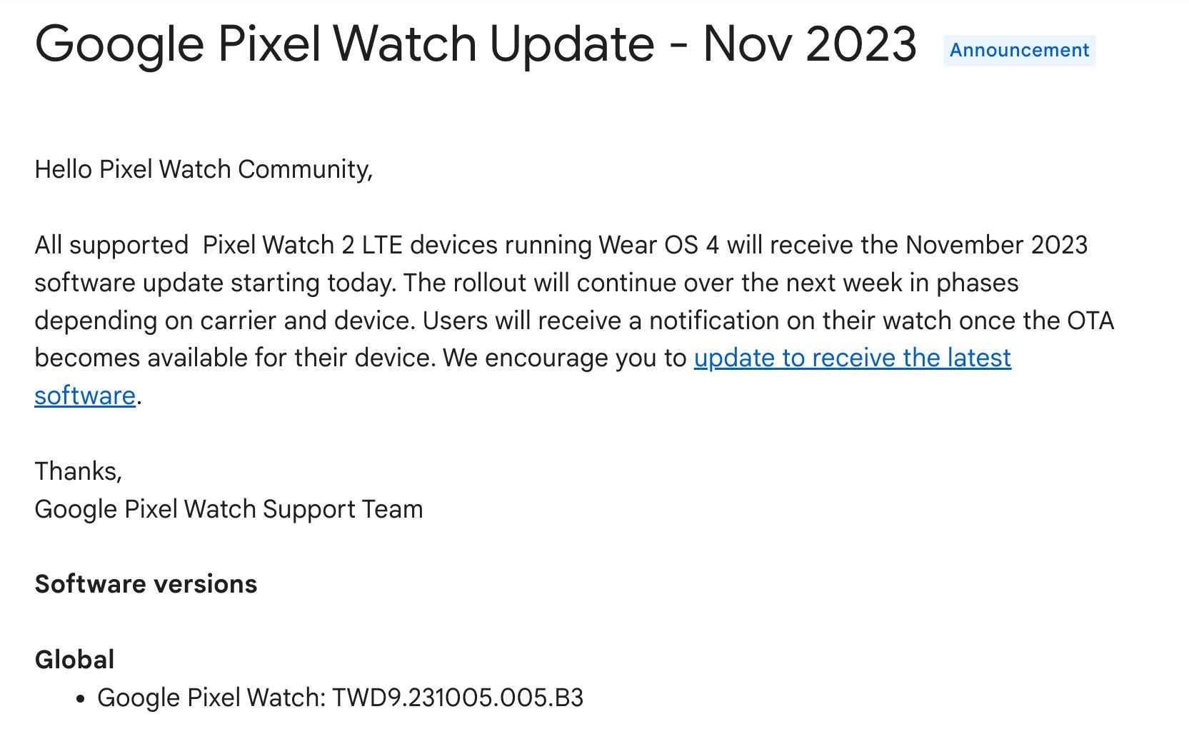 The November 2023 software update includes bug fixes and improvements for Pixel Watch 2 LTE users.Applicability of the device